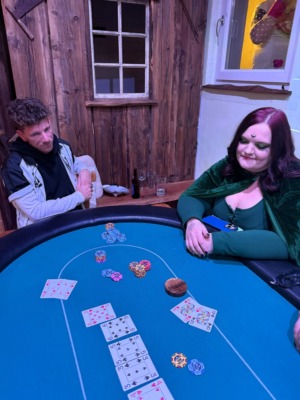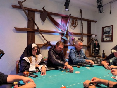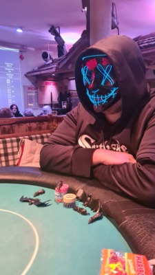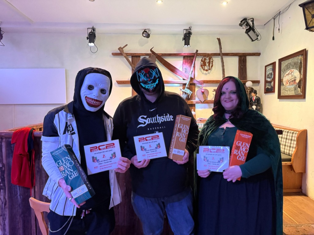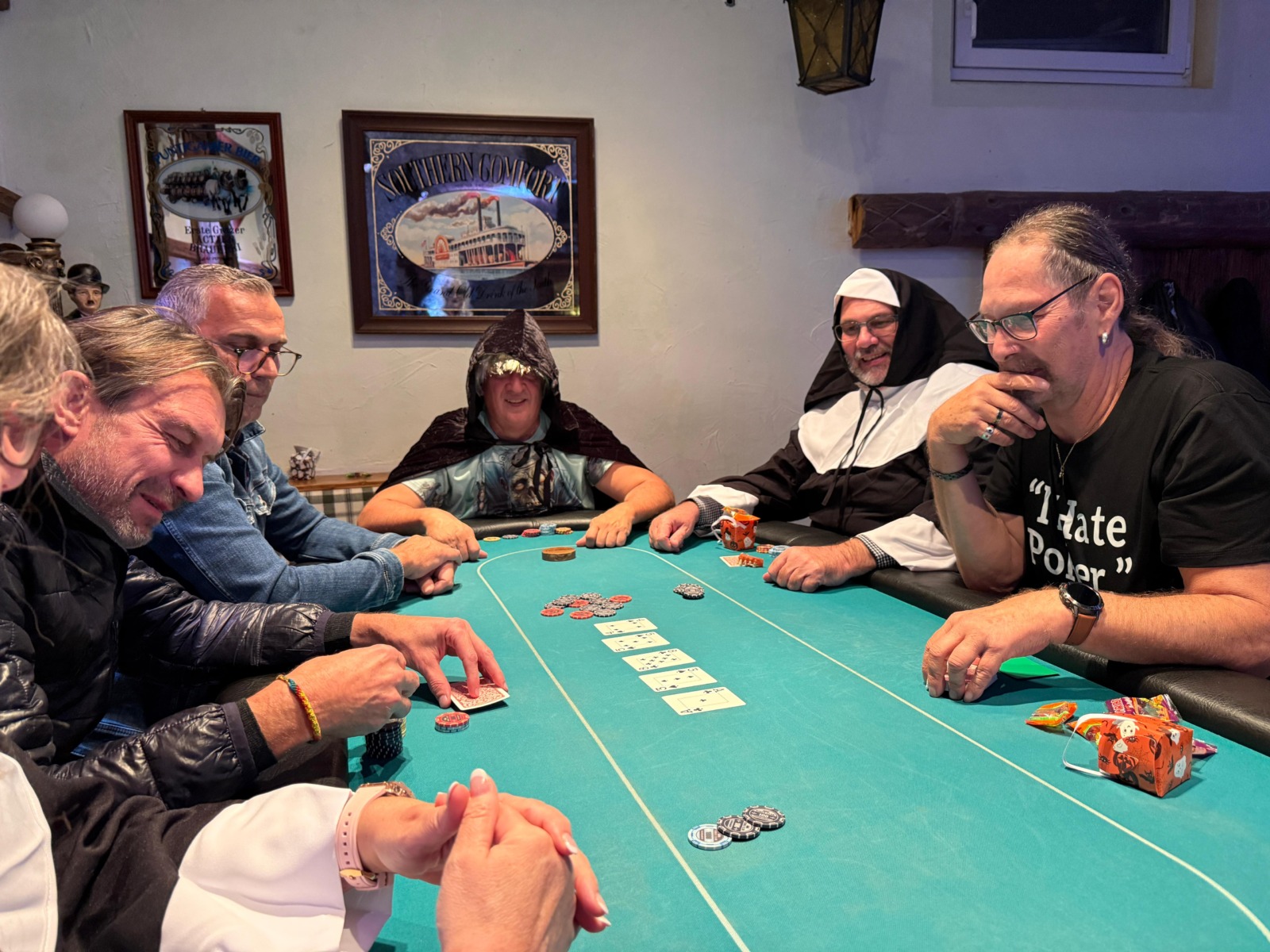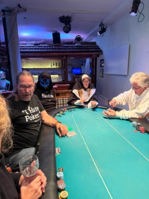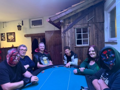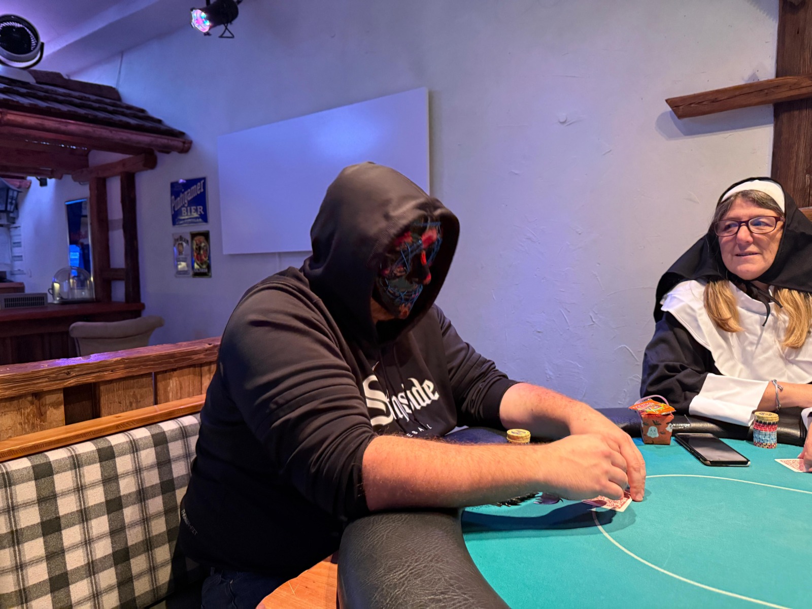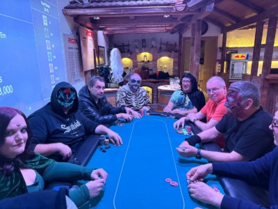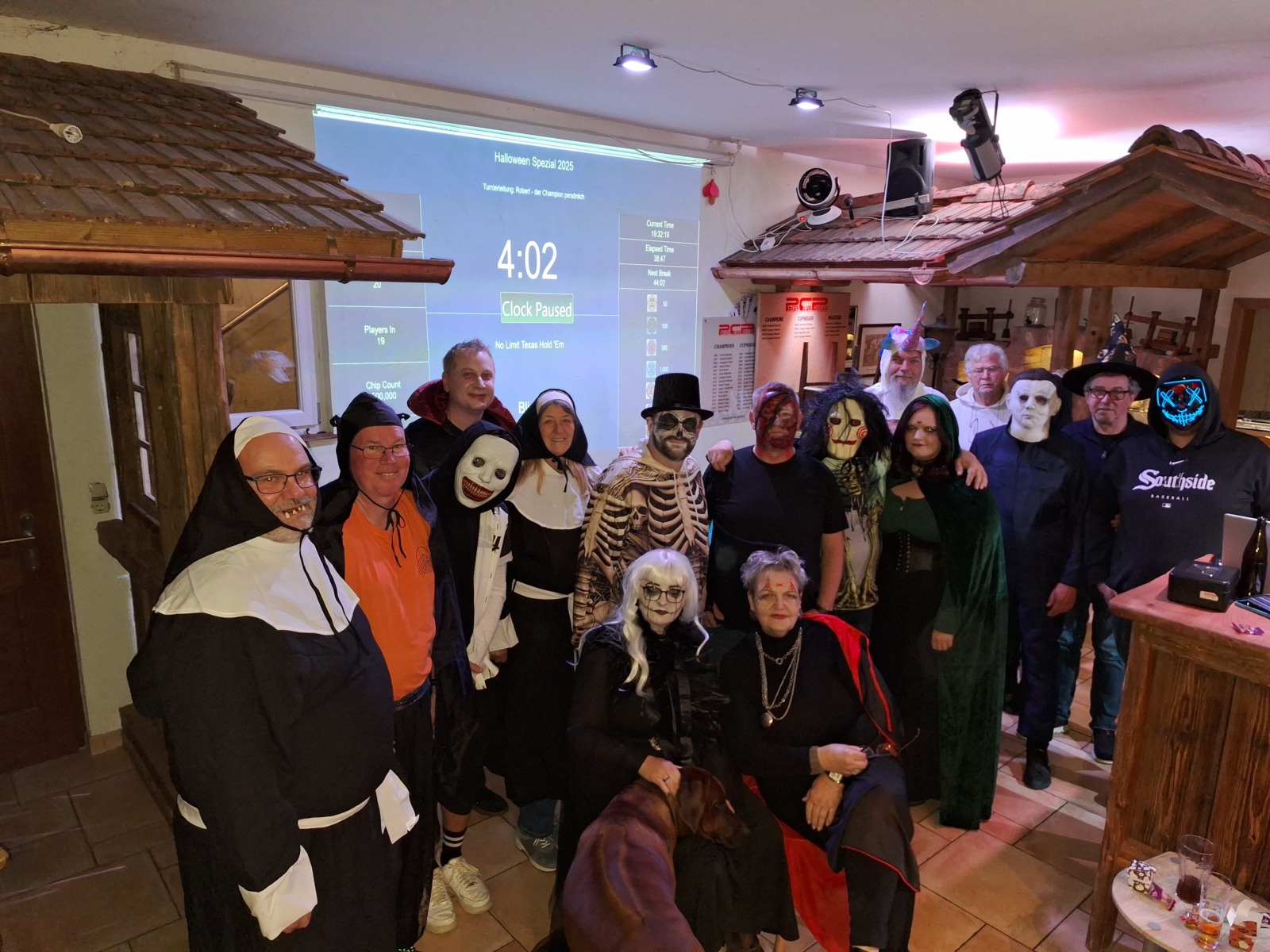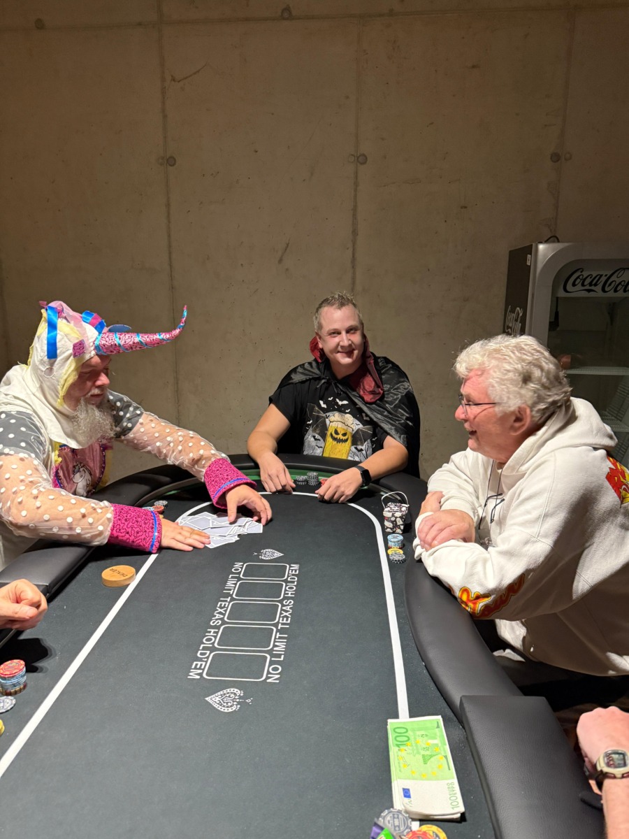 Floskeln beiseite – der wahre Grund war, dass Pokerbegeisterte einfach nur Spaß haben wollten. Und an alle, die keine Zeit oder Lust hatten: Ihr habt was versäumt! Nur ganz wenige waren nicht (oder mussten sich nicht?) verkleiden. Der Großteil hatte hervorragende Masken und tolle Kostüme. Da waren Jigsaw, der Tod, der Mann mit der blinkenden Maske, eine (böse?) Fee, ein Löwe, supergeile Nonnen, ein E-Biker, dem es auf die F….. geschmissen hat, das letzte Einhorn, Mickie Krause, der vereinzelt durch den Raum geisterte und, und, und … Aber eines hatten sie alle: Spaß ohne Ende!