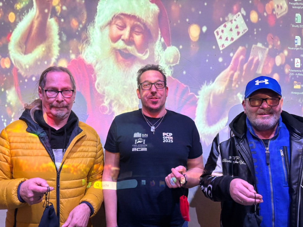 Markus Krusic, Hermann Schriebl und Hans Peter Tragut hießen die letzten verbliebenen um die Jetons. Wie es sich für die Weihnachtszeit gehört, handelten sie einen Deal aus. Jeder bekommt Jetons im Wert von 300 €. Um den übriggebliebenen 50-€-Jeton sollten drei Hände entscheiden.
