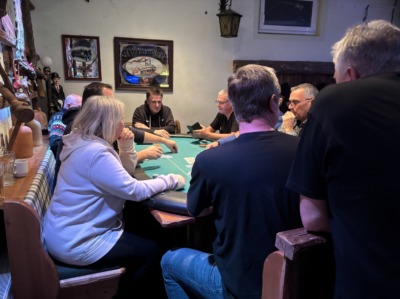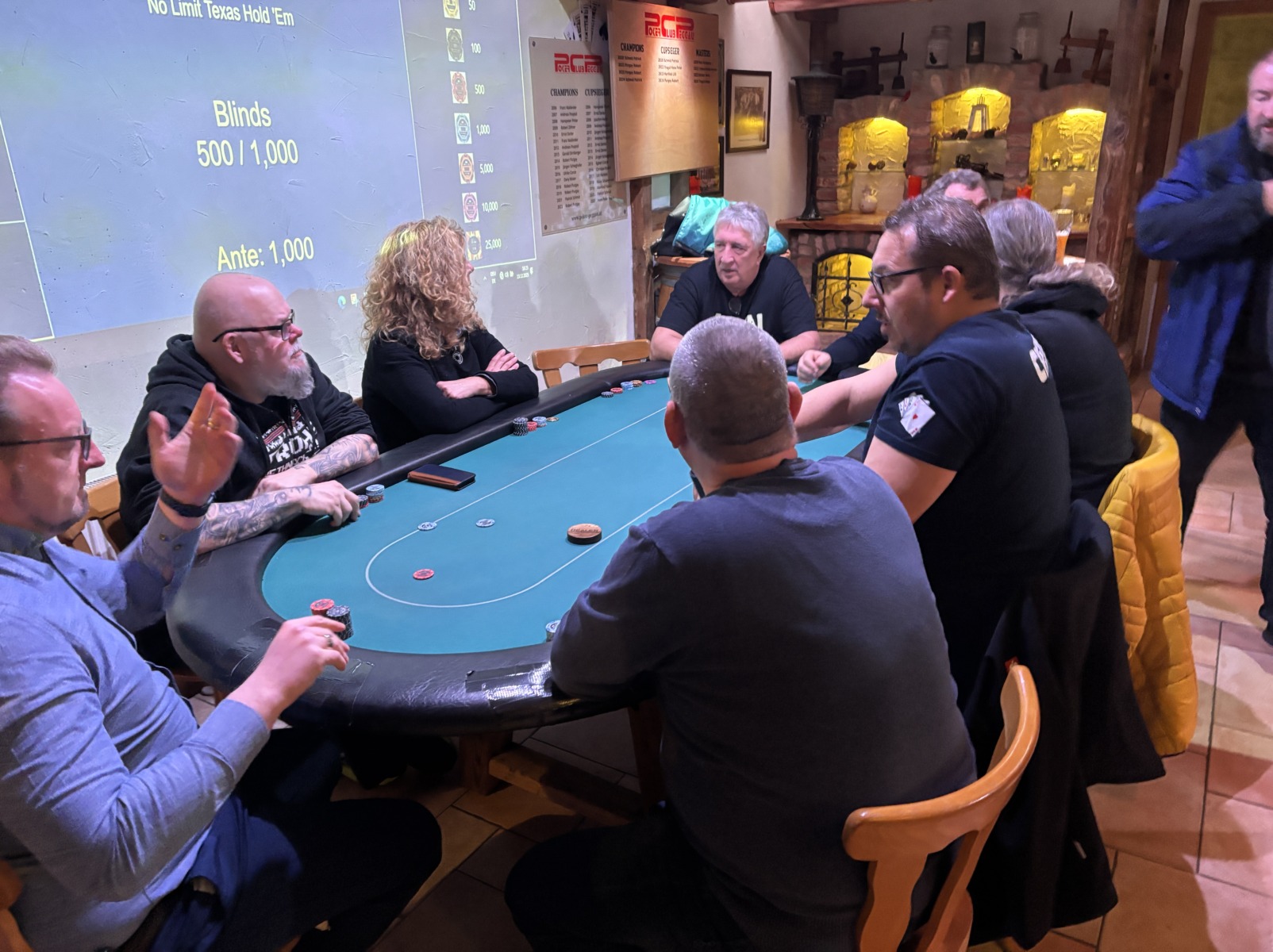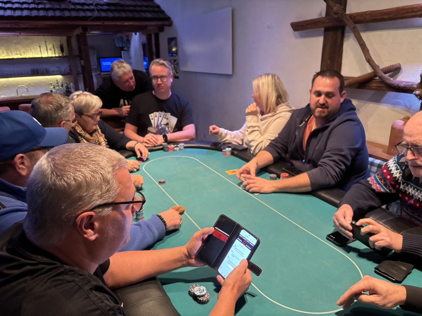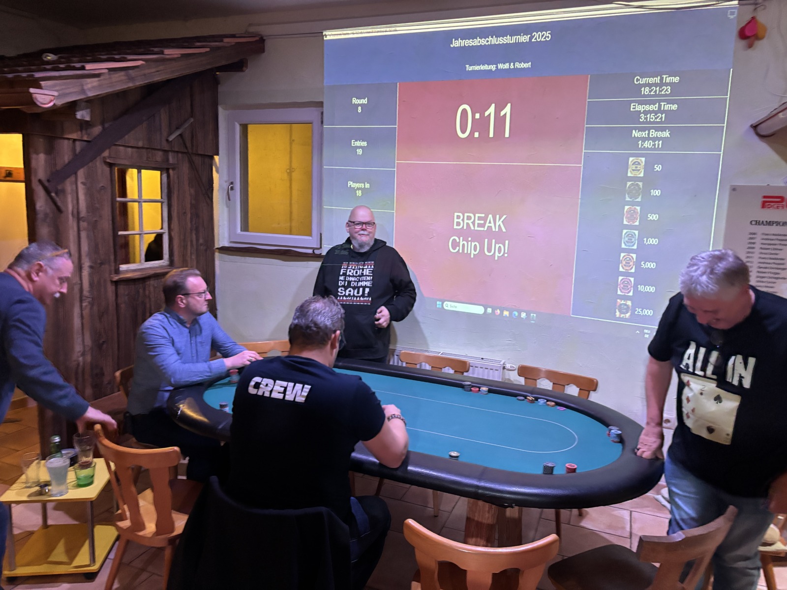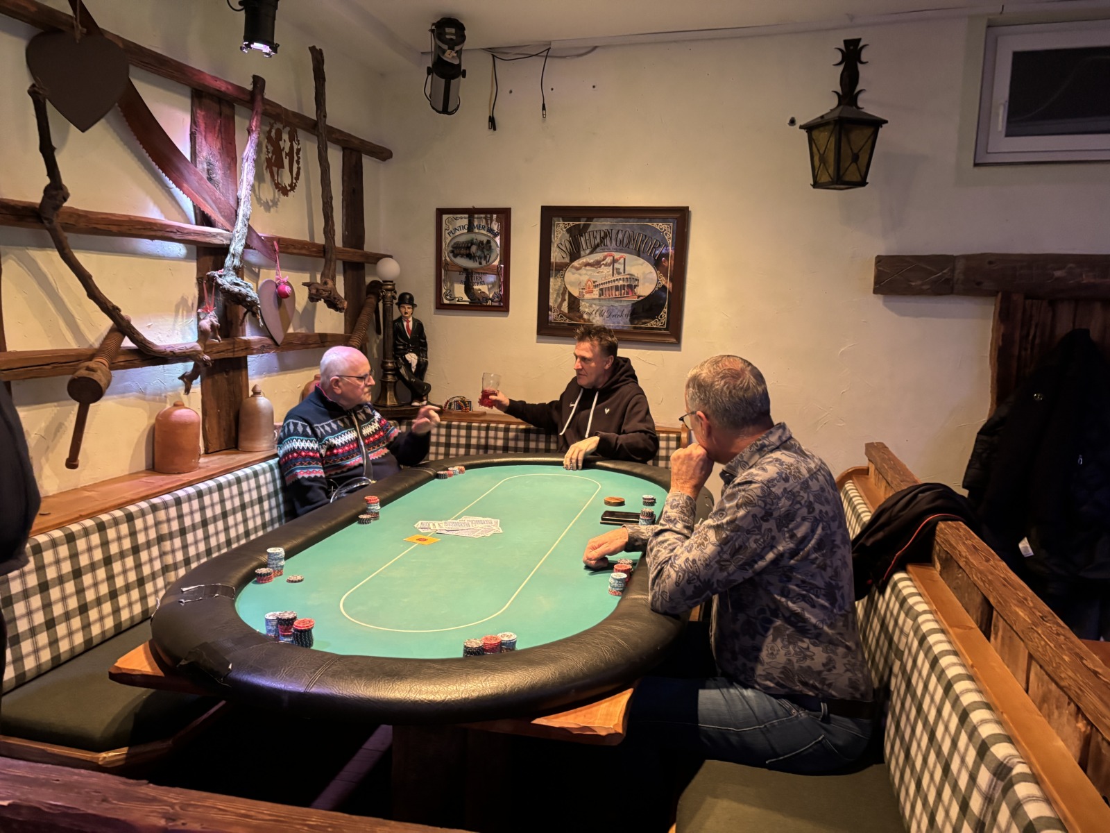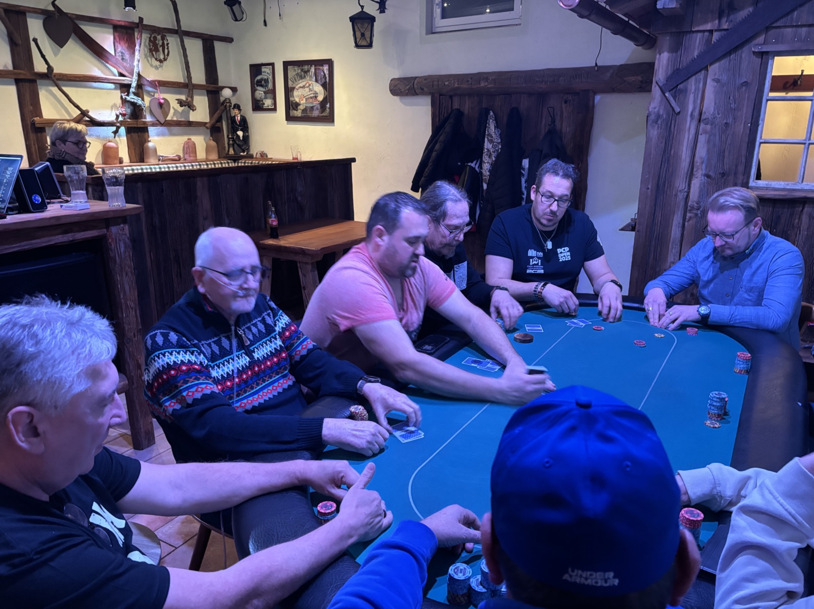 Eher wenig am Hut hatte das Christkind an diesem Tag mit Vizemeister Manuel Lamb und seiner Schattenspielerin Karla. Sie mussten als Erster das Turnier verlassen. Für Manuel war es trotzdem eine sehr gelungene Saison. Auch die beiden Oldies im Verein, Jürgen Schieghofer (18) und Robert Zöhrer (17), mussten schon sehr früh die Heimreise antreten. Ein Kuriosum am Rande: Matzer Peter, zu diesem Zeitpunkt sicher einer mit den großen Stacks, musste die Heimreise antreten, weil sein Bakir (der Familienhund der Matzers) partout nicht mehr dazu überredet werden konnte, mit in den Pokerkeller zu kommen. Der Obmann, Spezialist für Paranormales, schmunzelte und kannte vermutlich den Grund, hielt sich aber bedeckt.