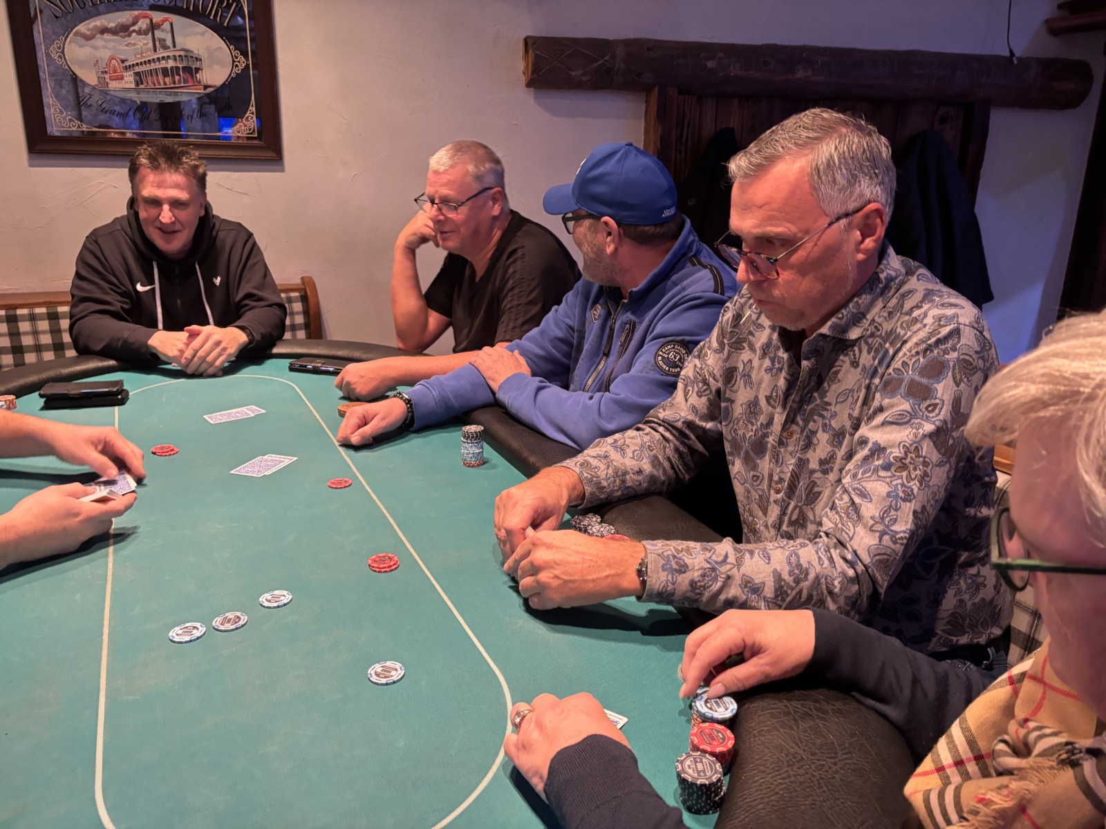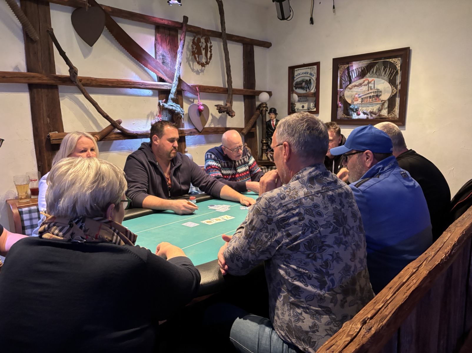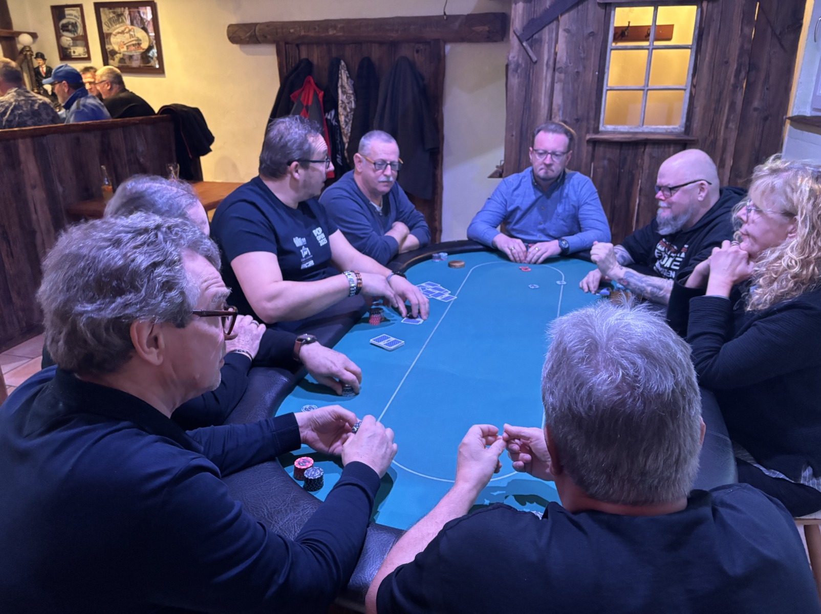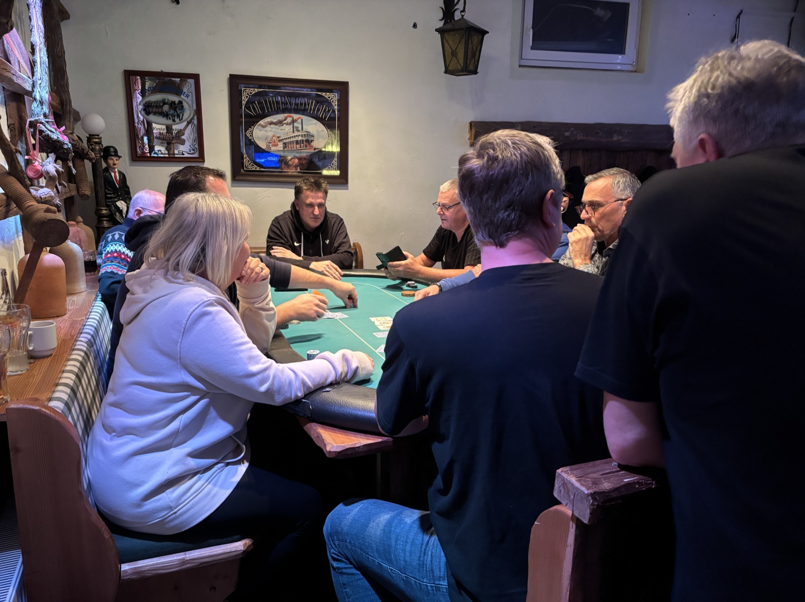 Obmann Robert Purgay bewies einige Male, dass er zu Recht Champion wurde. Das Shirt „All-in“ und seiner Lieblingshand 7-2 präsentierte er stolz. Ein Geschenk seiner Pokerfreunde zum 60er! Die passende Hand dazu passierte ein paar Hände zuvor. UTG sitzend raiste Markus bei Blinds von 500/1.000 auf 3.500. Alle folden bis zu Robert, der im BB sitzt. Nach kurzer Überlegung pusht er All-in. Markus überlegt lange und gibt die Hand auf. Im Gejohle der Mitspieler zeigt Robert offen seine Hand: 7-2! Allerdings reichte es nicht für ganz vorne. Platz vier – mit Sicherheit ein toller Ausklang der Saison für den Obmann!