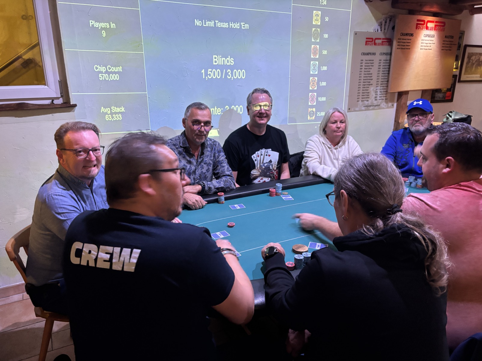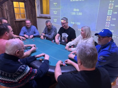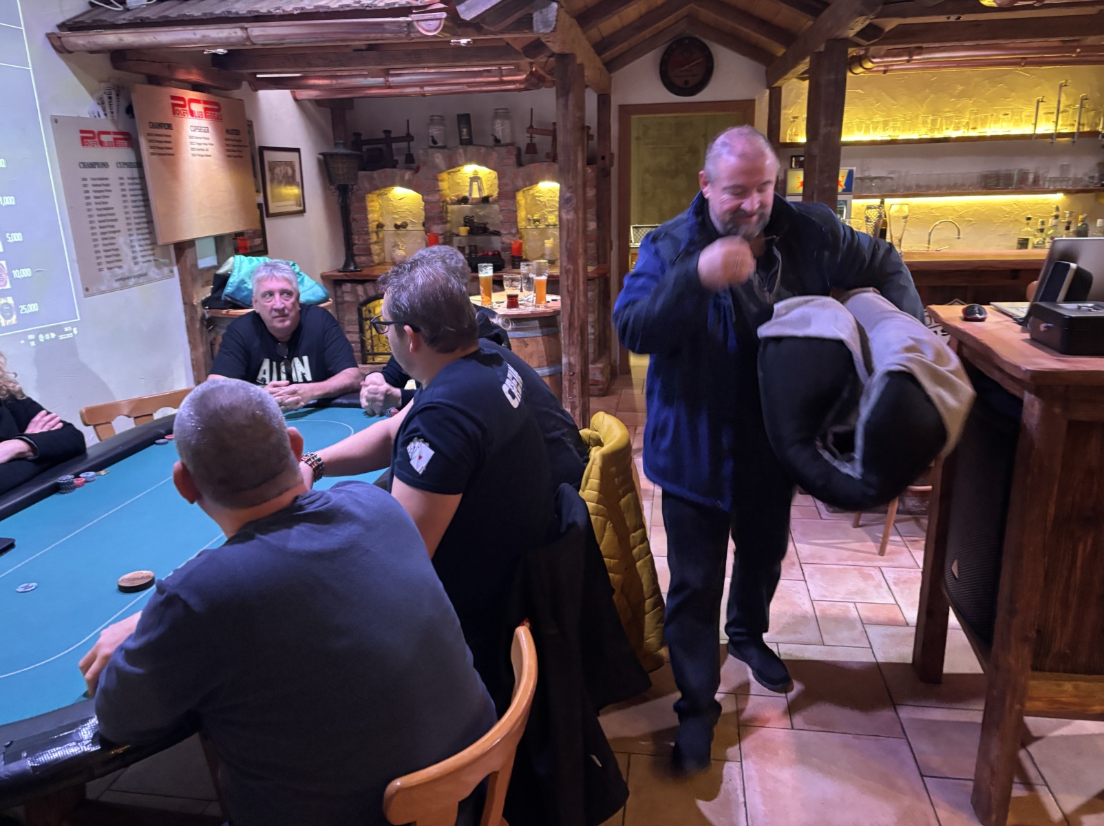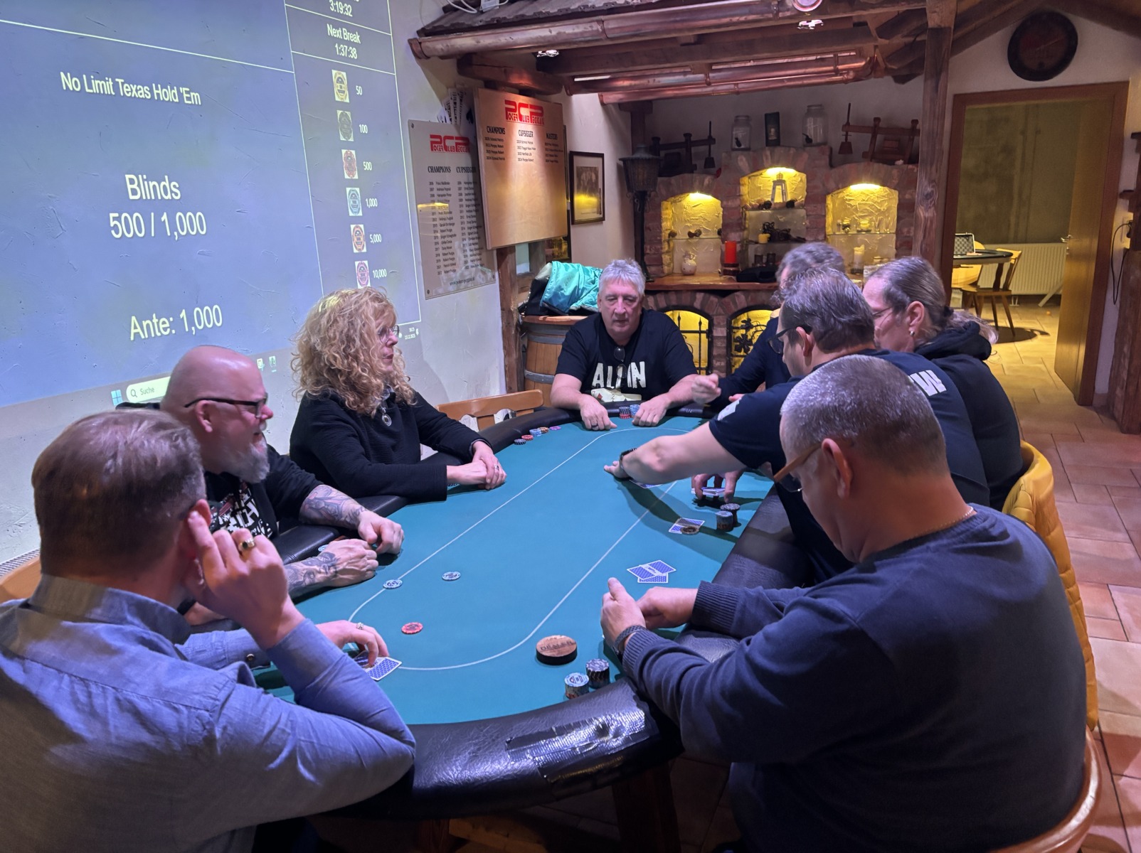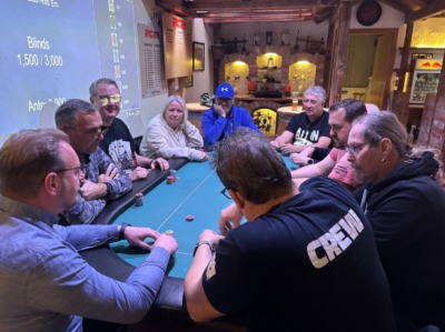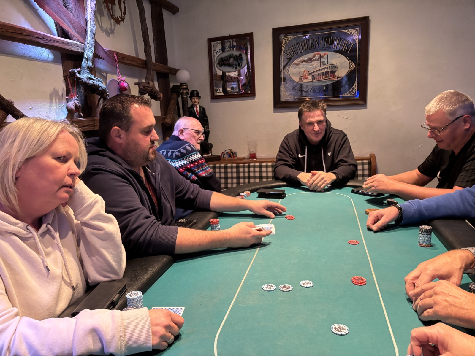 Obmann Robert Purgay bewies einige Male, dass er zu Recht Champion wurde. Das Shirt „All-in“ und seiner Lieblingshand 7-2 präsentierte er stolz. Ein Geschenk seiner Pokerfreunde zum 60er! Die passende Hand dazu passierte ein paar Hände zuvor. UTG sitzend raiste Markus bei Blinds von 500/1.000 auf 3.500. Alle folden bis zu Robert, der im BB sitzt. Nach kurzer Überlegung pusht er All-in. Markus überlegt lange und gibt die Hand auf. Im Gejohle der Mitspieler zeigt Robert offen seine Hand: 7-2! Allerdings reichte es nicht für ganz vorne. Platz vier – mit Sicherheit ein toller Ausklang der Saison für den Obmann!