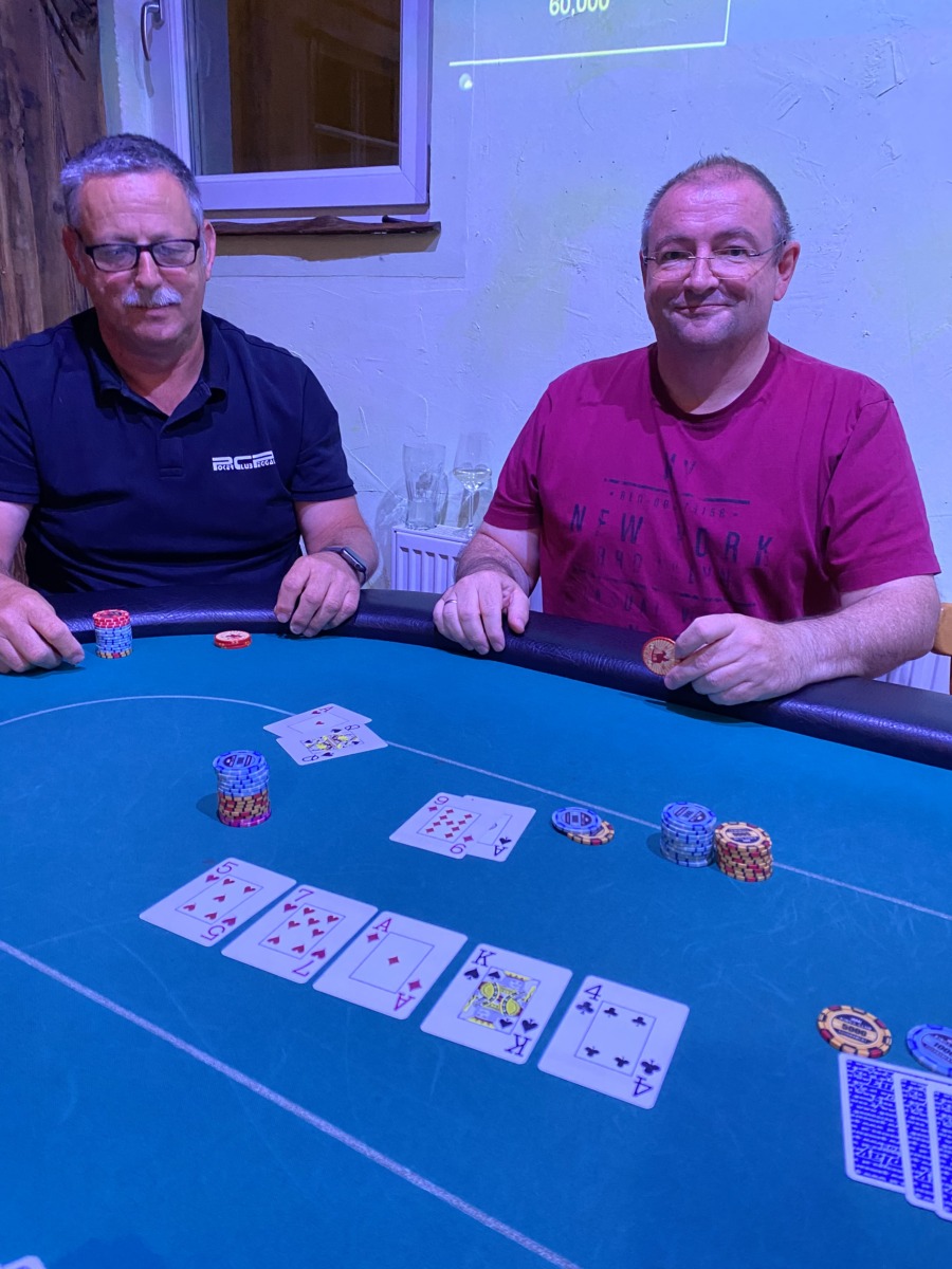 Kaum am Tisch Platz genommen und das Getränk noch dreiviertel voll, musste sich Jürgen Schieghofer (24) auch schon wieder erheben. Ein Paar Könige gegen das Assenpaar unseres Obmanns Robert Purgay und so oft normalerweise noch ein König kommen mag, blieb dieser diesmal aus und Robert verdoppelte sein Stack gleich nach 18 Minuten.