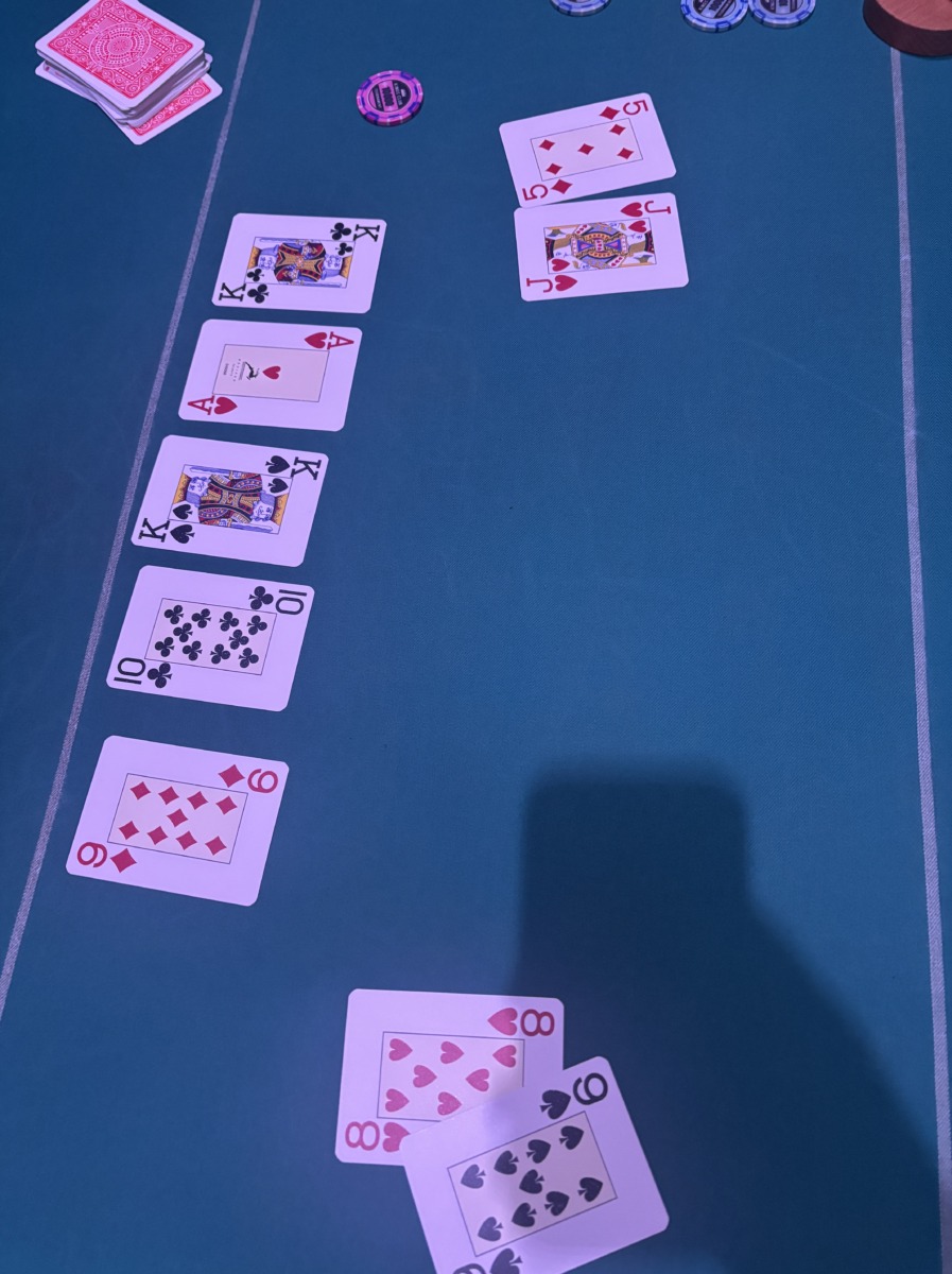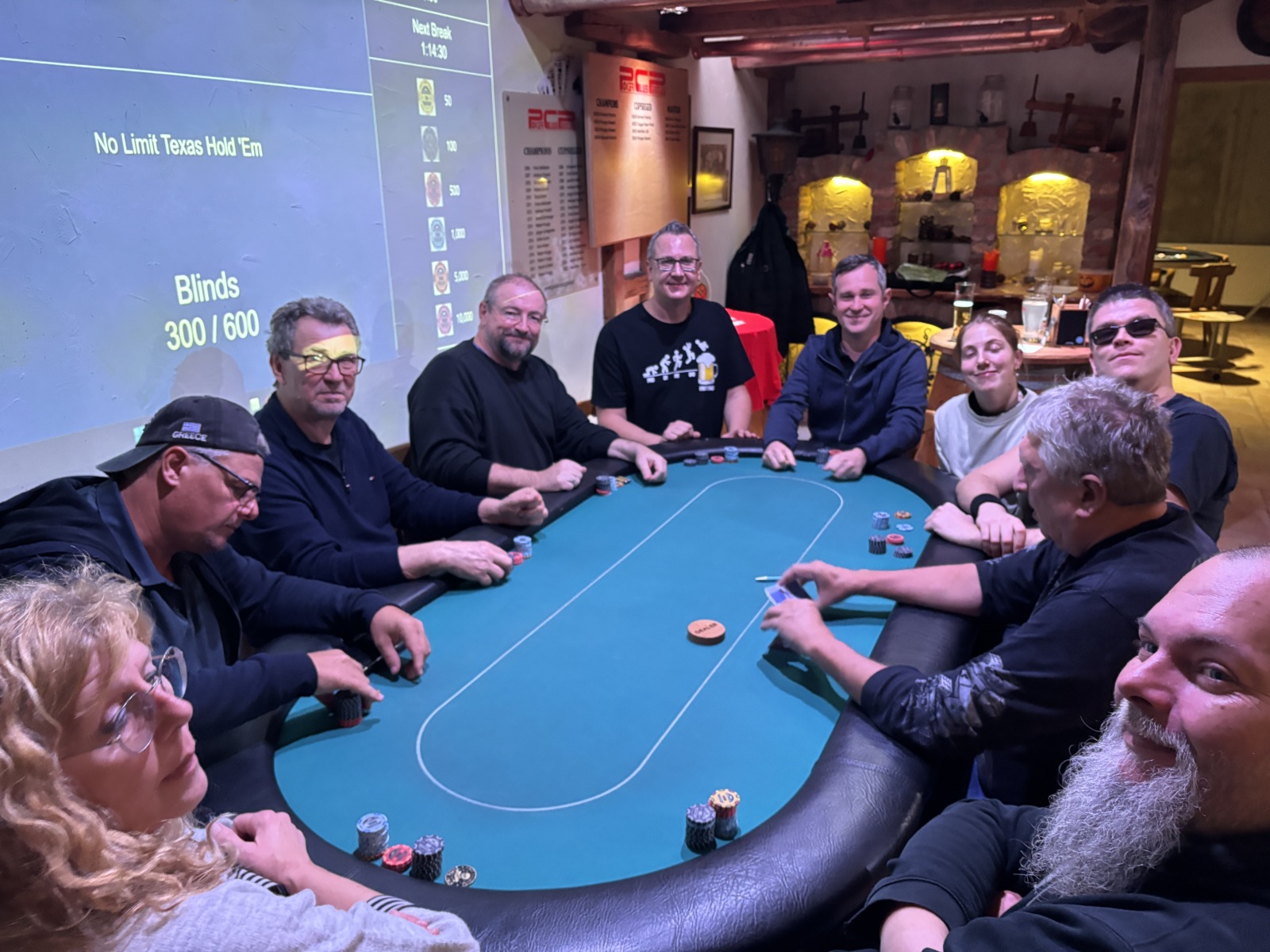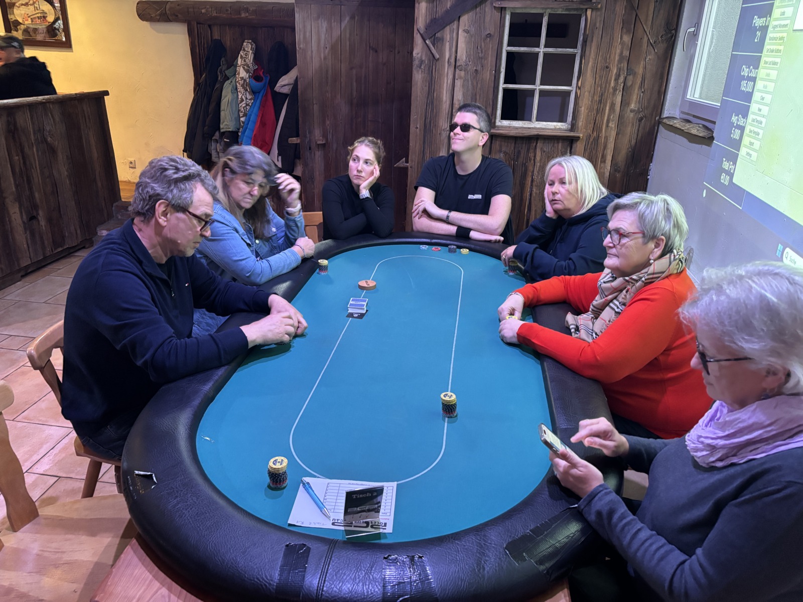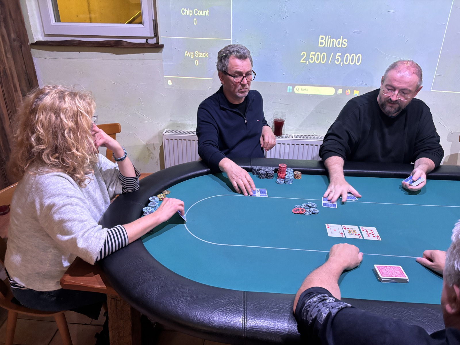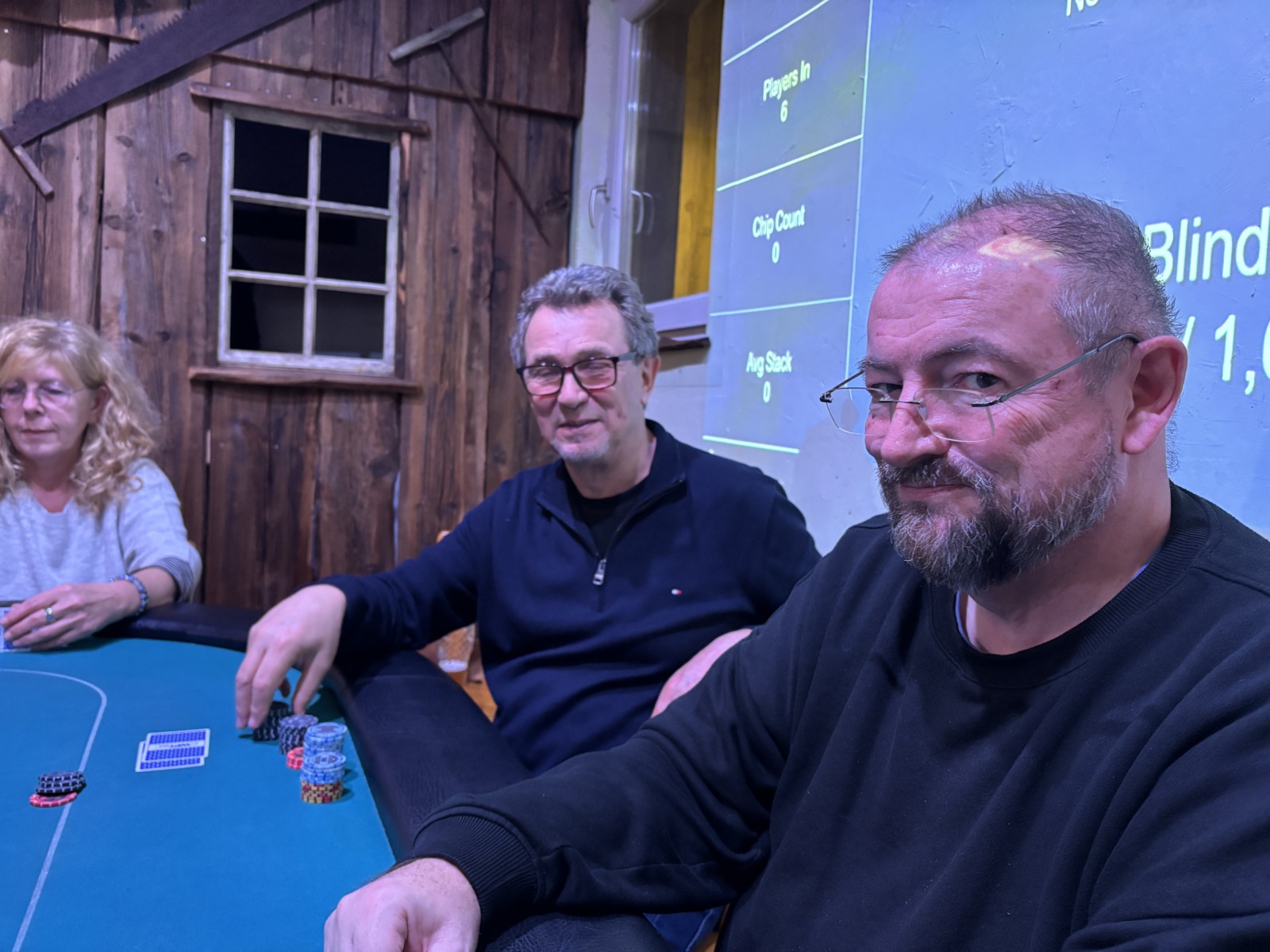 Mit drei 3 dritten Plätzen sprich je 10 Punkte, konnte sich unser Obmann-Stellvertreter mit 30 Punkten auf Platz 8 für das Finale des Pokercups 2025 qualifizieren. Die große Pause wurde diesmal erst nach den Vorrunden abgehalten. Nachdem die Chips für die 8 übrig gebliebenen Spieler vorbereitet waren, startete das Turnier um ca. 20:15 Uhr pünktlich zum Hauptabendprogramm neu.
