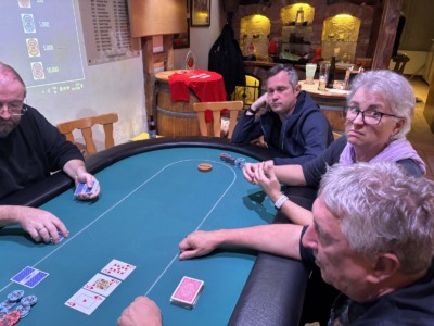 Zurück zum Turnierverlauf, es kam bereits nach kurzer Zeit zum Duell zwischen Jürgen und Peter F.. Wenn die richtigen Hände aufeinandertreffen und das gleich ein paar Mal hintereinander, kann es passieren das einer fast keine Chips mehr hat und der Andere sehr viele.
