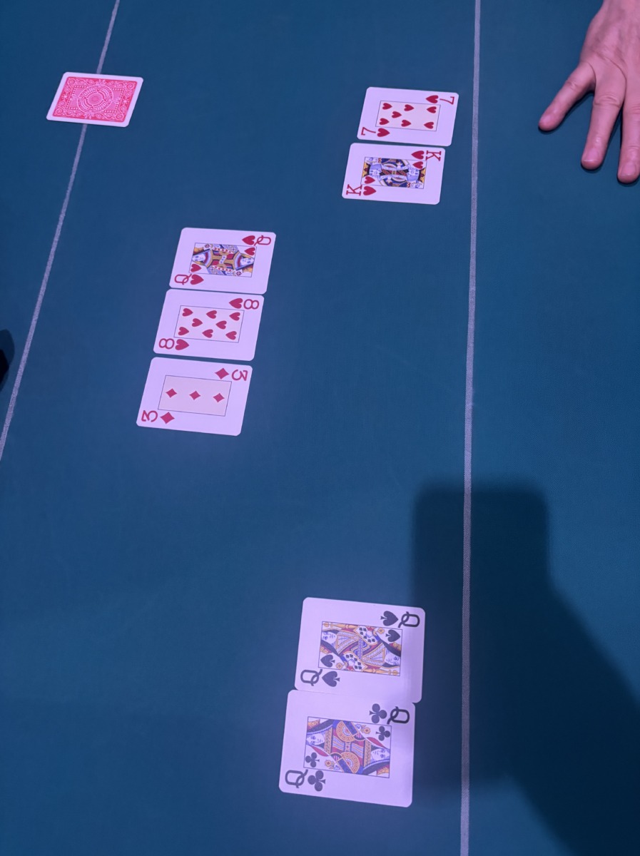Wolfgang’s versuchte als Small-Blind einen Move und pushte mit Dame/Zehn All In, in der Hoffnung die Blind’s abzugreifen. Gerald hatte ein paar Könige auf der Hand. Game Over – Wolfgang war als 4ter raus aus dem Geschehen.