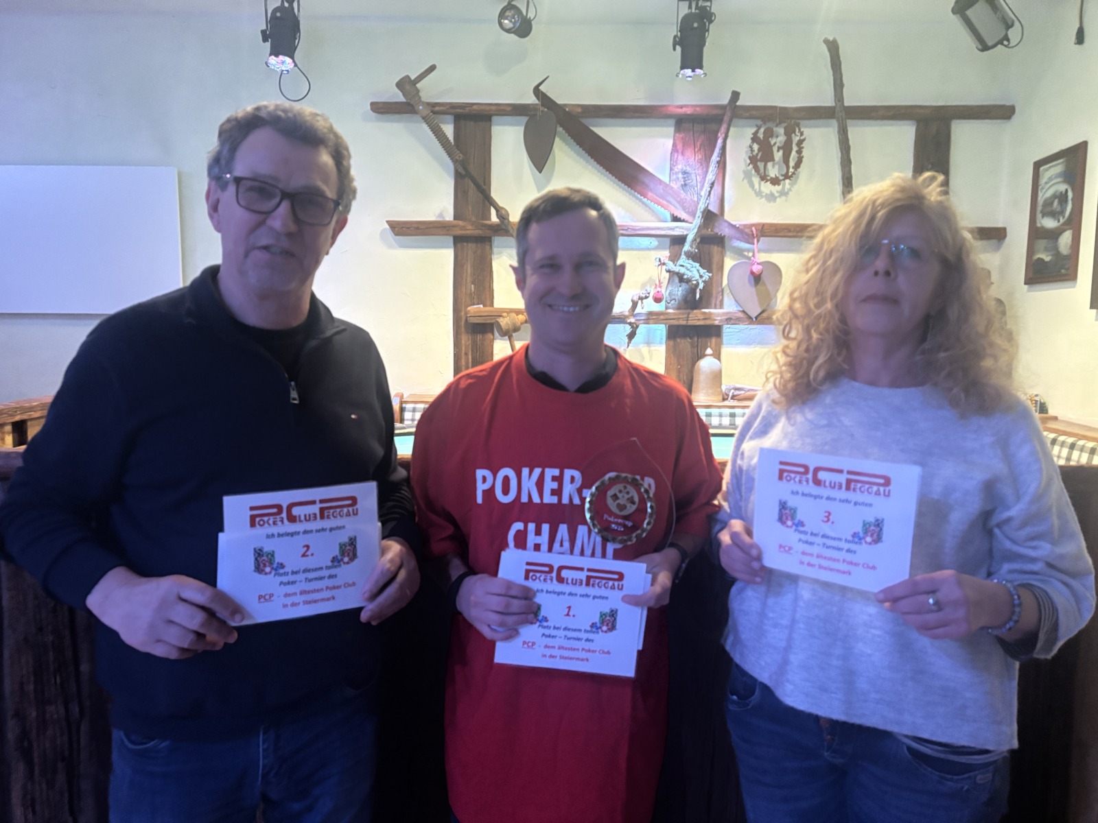 Manuel Lamb, Gerald Dirnberger, Jürgen Schieghofer, Peter Matzer, Margarete Scherz, Gerald Huber (das Einhorn) und Wolfgang Tschermoneg als Smallstack, komplettierten den Final Table. Als Dealer fungierte unser Obmann Robert Purgay.