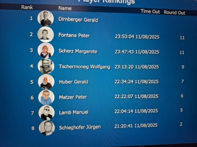 Den 8. Platz mit der letzten Hand erkämpft hat sich hingegen Wolfgang Tschermoneg, welcher mit Jürgen Schieghofer bis zur letzten Hand um dem 3. Platz in der 3 Runde auf Tisch 2 kämpfte. Nur wenige Chips unterschieden die 2 Spieler bis zum Schluss, sodass Jürgen All-In ging und Wolfgang callte.