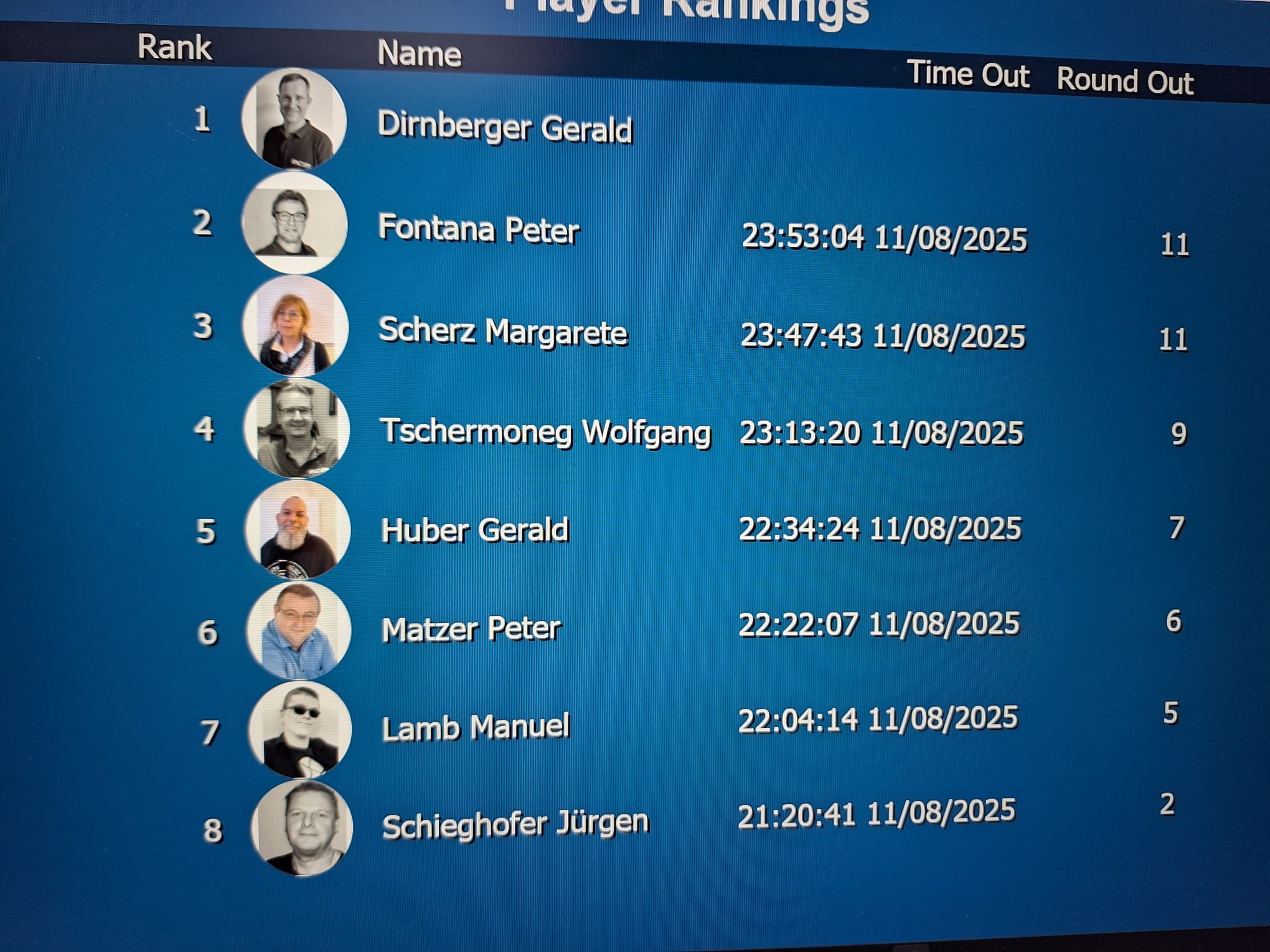 Dadurch stand auch fest, dass das Masters 2025 am 21. November mit 9 Spielern gespielt wird, da sich alle verbliebenen Spieler nicht über die Meisterschaft qualifiziert hatten. Und durch das frühe Ausscheiden von Jürgen, stand auch fest, dass es einen neuen Namen auf der Siegertafel in der Sparte Pokercup gibt.
