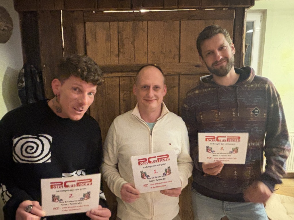 Mit drei Karten zu Beginn, wobei man eine Karte nach dem Flop ablegen muss, wird es tatsächlich schwer zu entscheiden. War erst noch das Königs-Pärchen die beste Hand, kann urplötzlich der Draw auf Flush, Fullhouse etc. die bessere Wahl sein. Wie verrückt diese Pokervariante ist, musste der erste unserer fünf Gäste am eigenen Leib spüren. Moritz Hackls Tag endete nach 20 Minuten auf Platz 22. Klaus Schabernack, unser frisch gebackener Kassier-Stellvertreter, war zum ersten Mal (mit Ausbilder Robert Purgay) als Turnierverantwortlicher tätig. Er schied leider bereits nach einer Stunde auf Platz 21 aus, aber seinen Job als einer der beiden Turnierleiter machte er hervorragend! Für Manfred Vipauz (20), Gast Franz Herberstein (19) und Gerald Huber (18) endete das Turnier ebenso schnell.