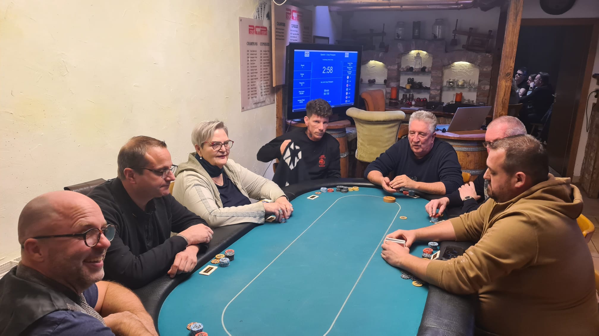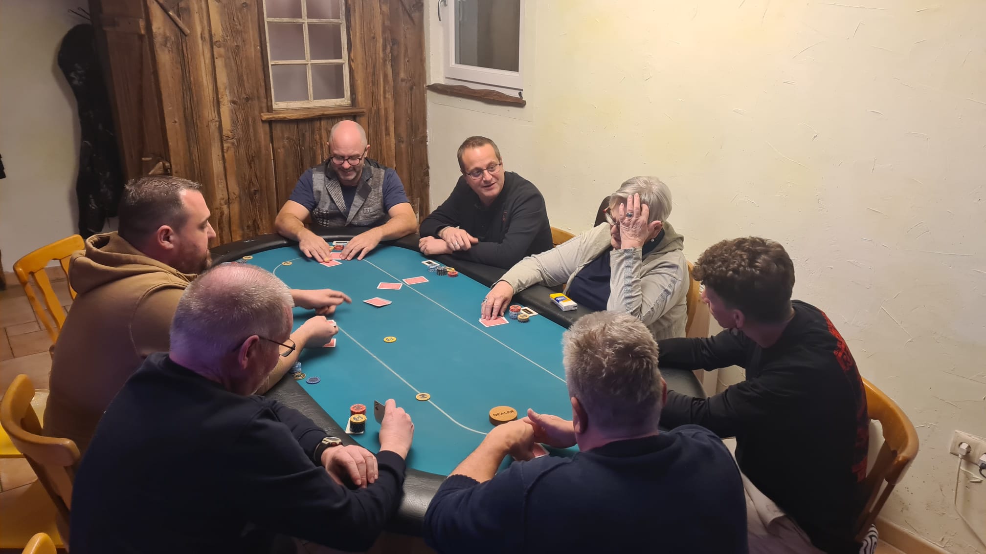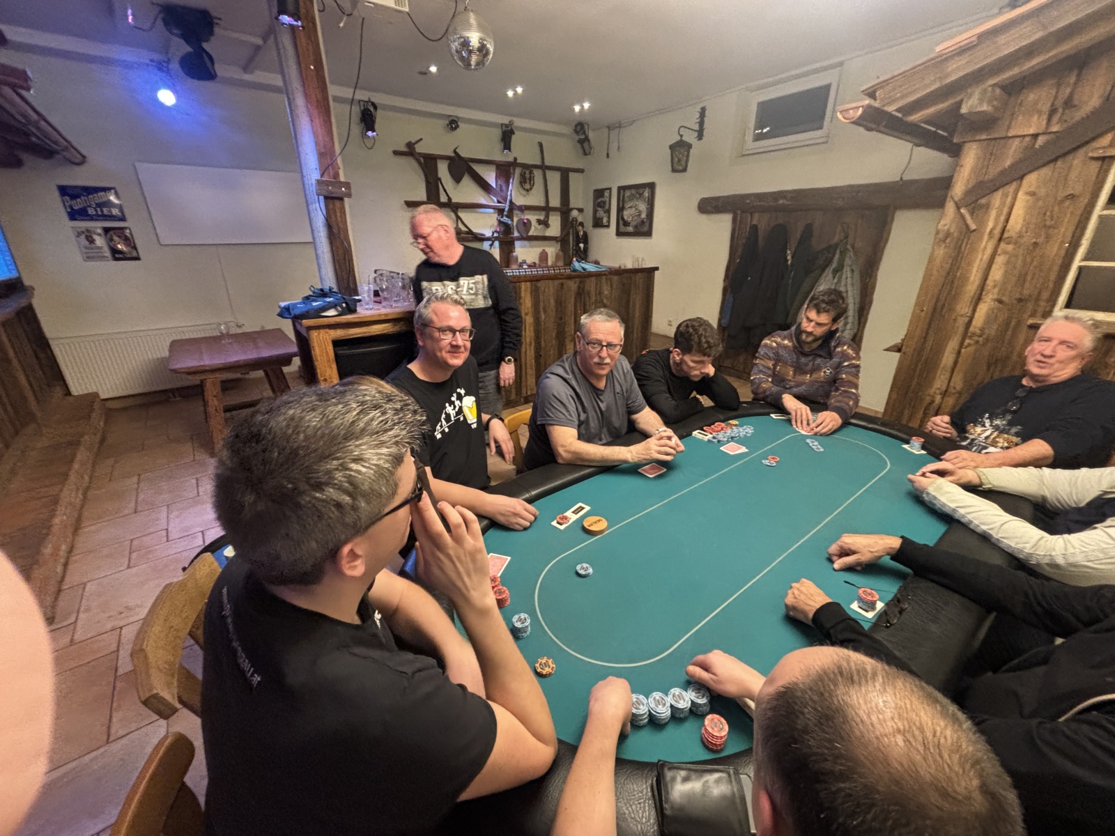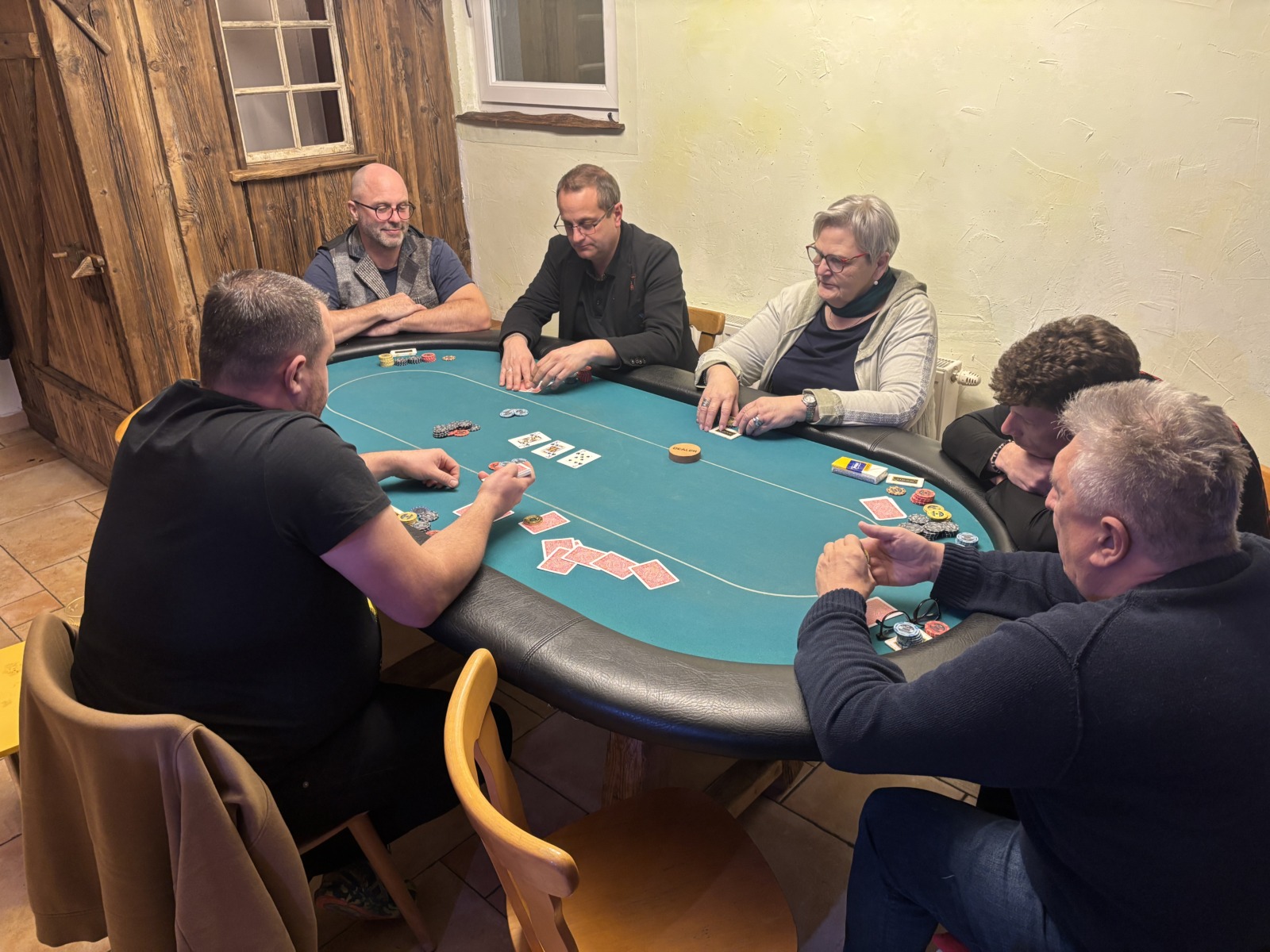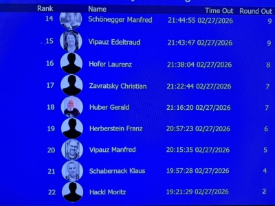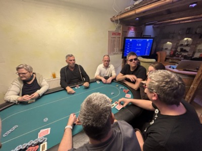 Mit drei Karten zu Beginn, wobei man eine Karte nach dem Flop ablegen muss, wird es tatsächlich schwer zu entscheiden. War erst noch das Königs-Pärchen die beste Hand, kann urplötzlich der Draw auf Flush, Fullhouse etc. die bessere Wahl sein. Wie verrückt diese Pokervariante ist, musste der erste unserer fünf Gäste am eigenen Leib spüren. Moritz Hackls Tag endete nach 20 Minuten auf Platz 22. Klaus Schabernack, unser frisch gebackener Kassier-Stellvertreter, war zum ersten Mal (mit Ausbilder Robert Purgay) als Turnierverantwortlicher tätig. Er schied leider bereits nach einer Stunde auf Platz 21 aus, aber seinen Job als einer der beiden Turnierleiter machte er hervorragend! Für Manfred Vipauz (20), Gast Franz Herberstein (19) und Gerald Huber (18) endete das Turnier ebenso schnell.