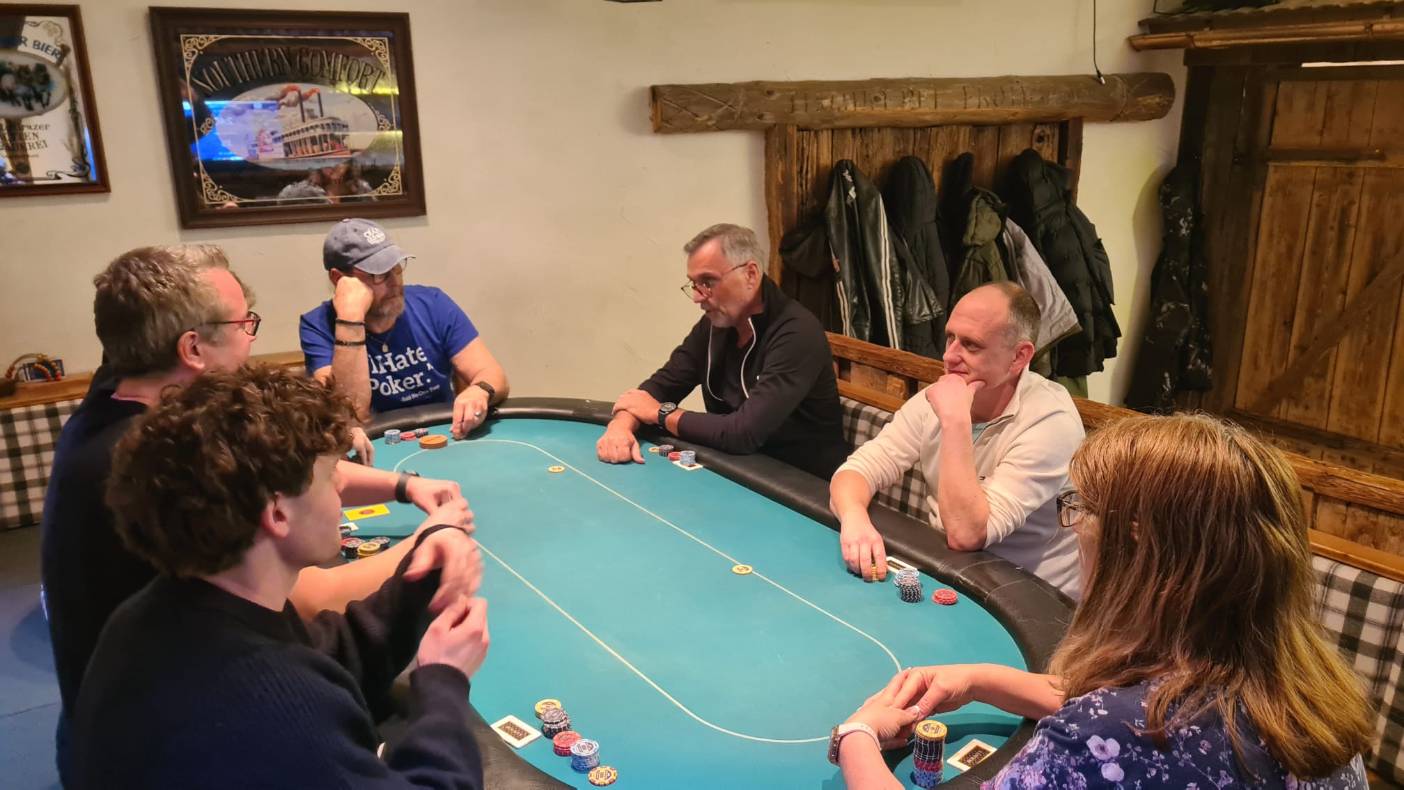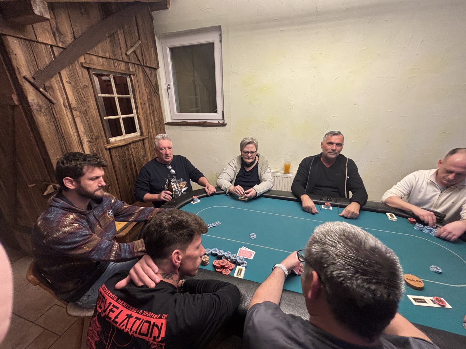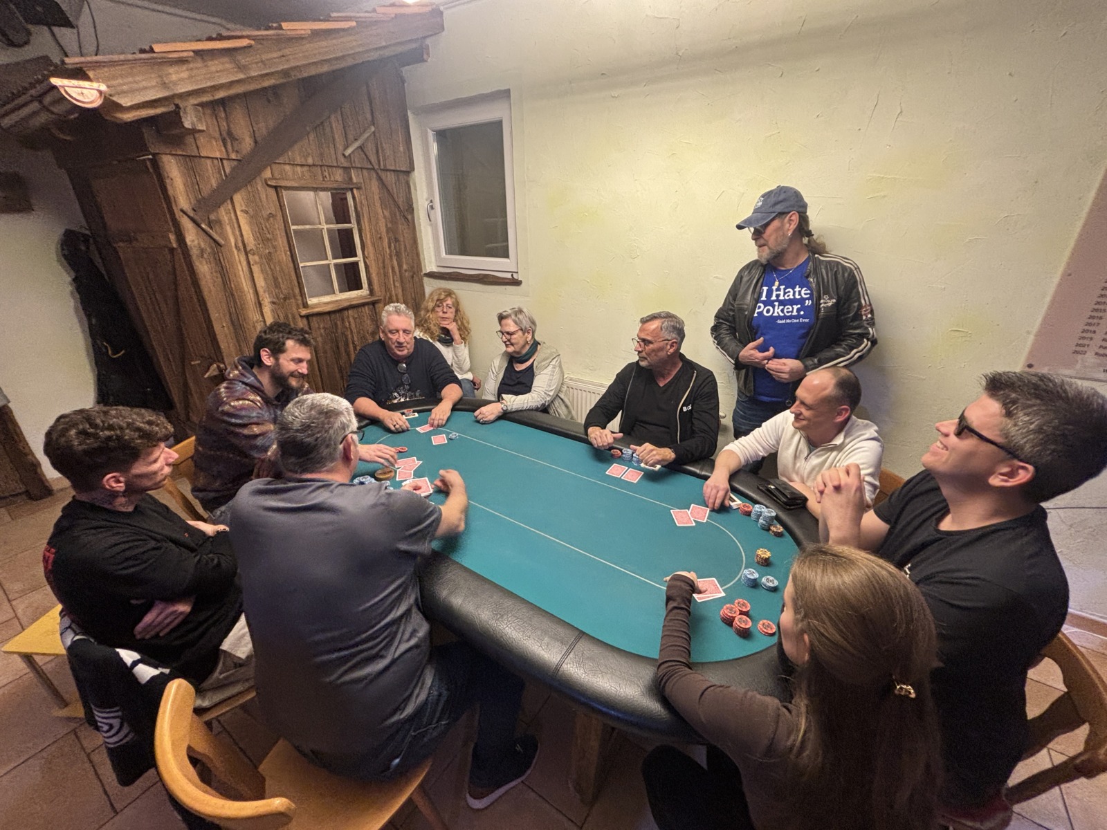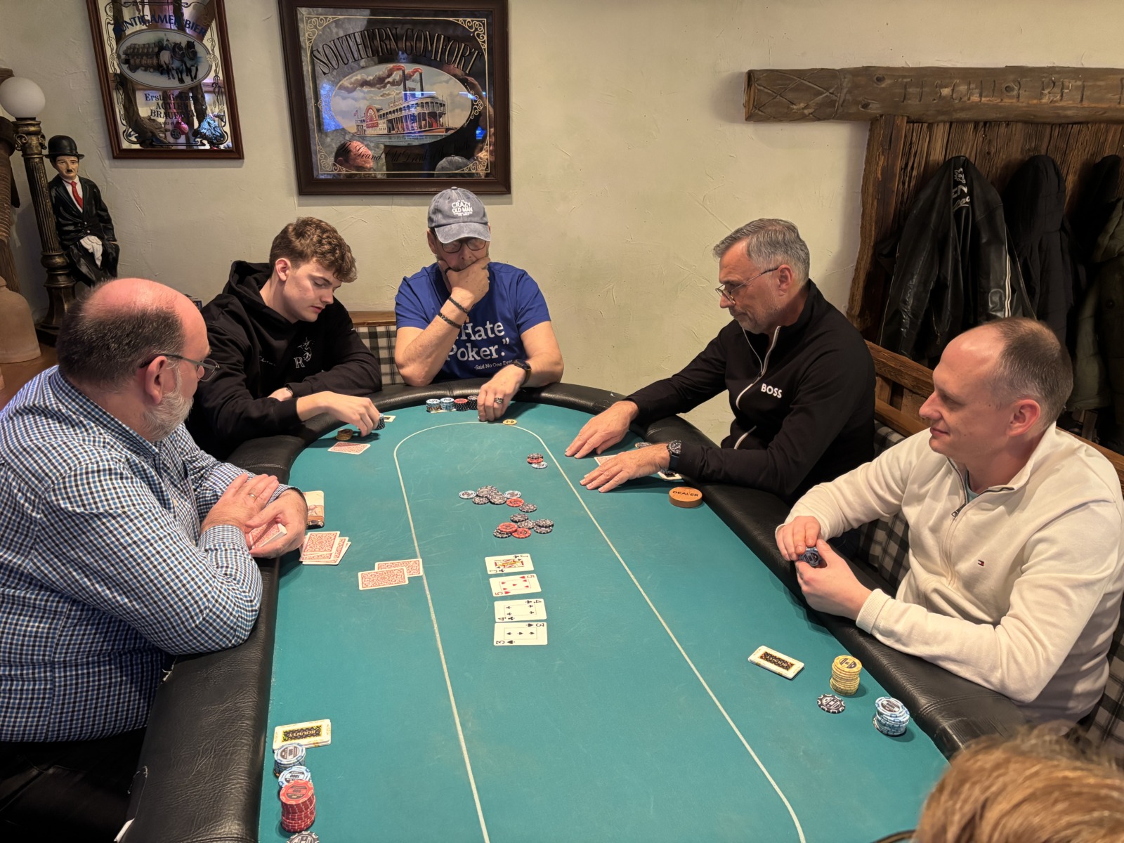 Mit drei Karten zu Beginn, wobei man eine Karte nach dem Flop ablegen muss, wird es tatsächlich schwer zu entscheiden. War erst noch das Königs-Pärchen die beste Hand, kann urplötzlich der Draw auf Flush, Fullhouse etc. die bessere Wahl sein. Wie verrückt diese Pokervariante ist, musste der erste unserer fünf Gäste am eigenen Leib spüren. Moritz Hackls Tag endete nach 20 Minuten auf Platz 22. Klaus Schabernack, unser frisch gebackener Kassier-Stellvertreter, war zum ersten Mal (mit Ausbilder Robert Purgay) als Turnierverantwortlicher tätig. Er schied leider bereits nach einer Stunde auf Platz 21 aus, aber seinen Job als einer der beiden Turnierleiter machte er hervorragend! Für Manfred Vipauz (20), Gast Franz Herberstein (19) und Gerald Huber (18) endete das Turnier ebenso schnell.