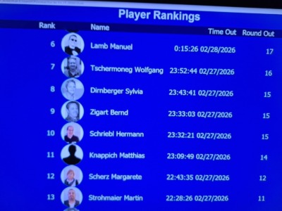 Als Gast Matthias Knappich auf Platz 11 ausschied, freuten sich die PCPler. Die Punkteränge waren erreicht. Hermann Schriebl (10) und Bernd Zigart (9) erwischte es zeitgleich. Das Doppelte-out eröffnete den Finaltisch mit acht Spielern.